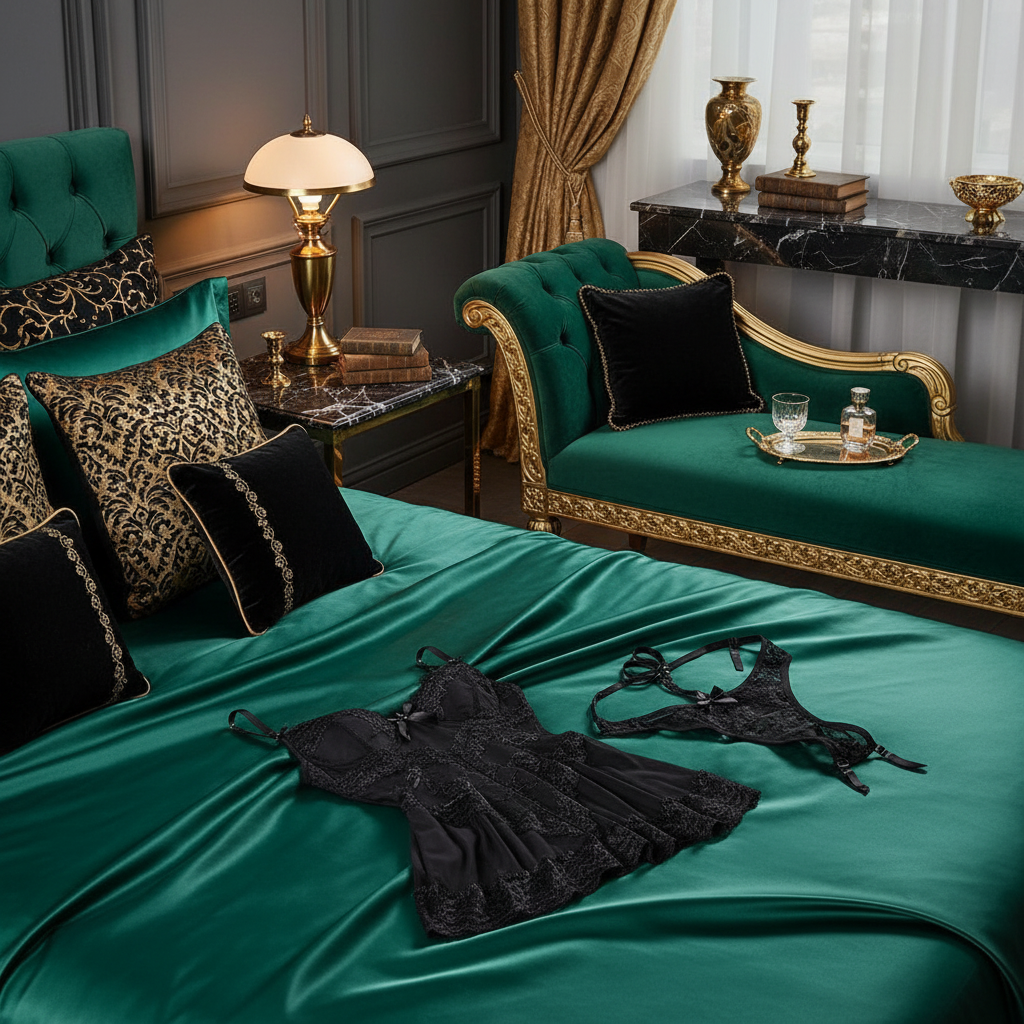 Black sheer lace babydoll lingerie on emerald green silk sheets with black and gold luxury boudoir styling