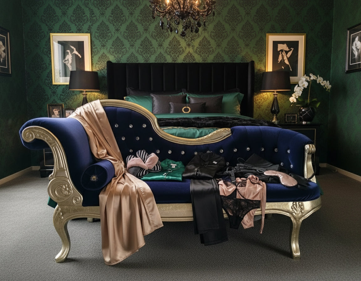 White sheer lace babydoll lingerie on emerald green silk sheets with black and gold luxury boudoir styling