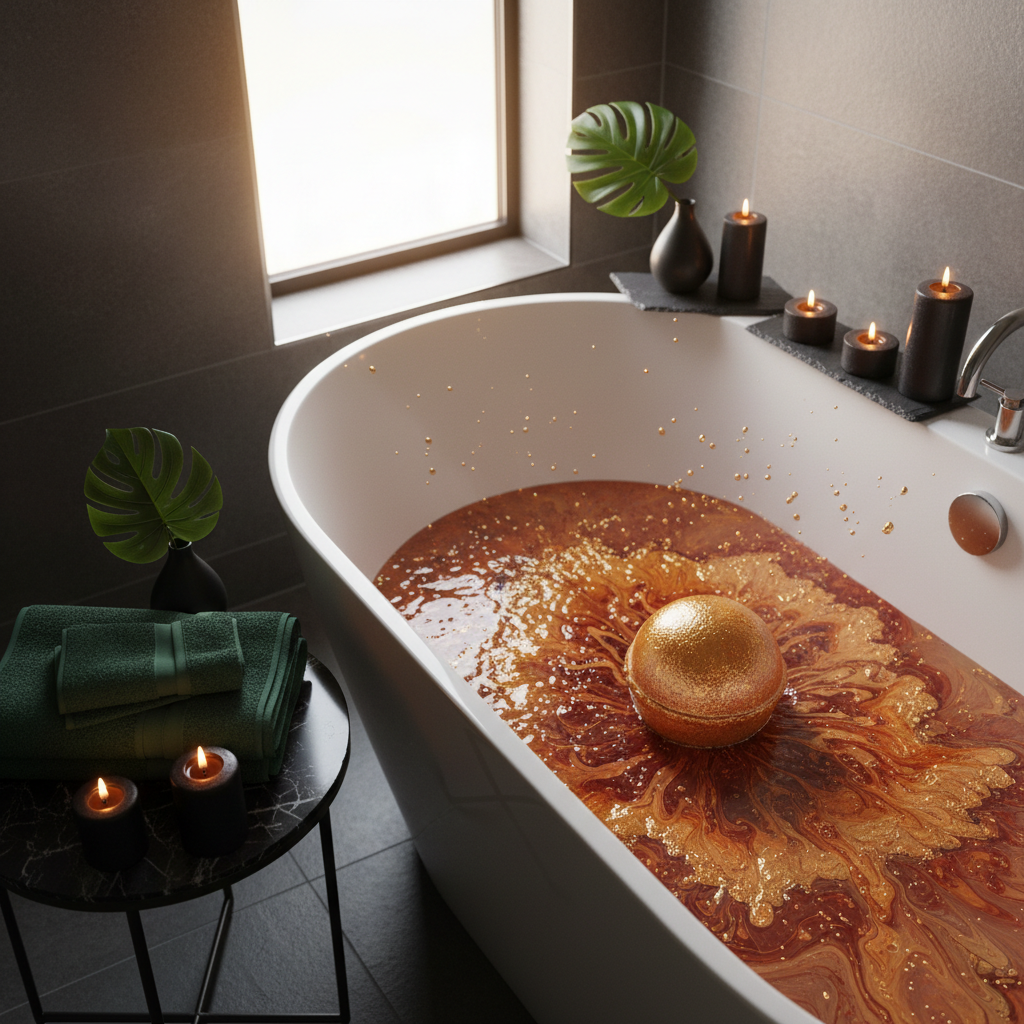 Helios Bath Bomb fizzing in luxury bathtub with golden swirls and emerald green spa styling